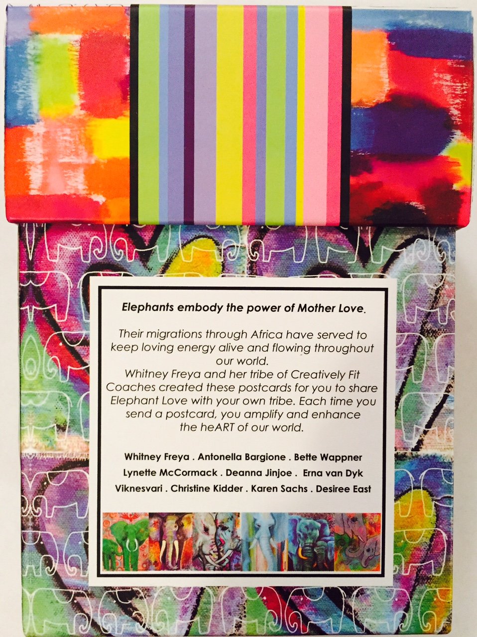 100 Full Color, Premium Postcards to Share or Display Elephants embody the power of Mother Love. Their migrations through Africa have served to keep loving energy alive & flowing throughout our world. Whitney Freya & her tribe of Creatively Fit Coaches created these postcards for you to share Elephant Love with your own tribe. Each time you send a postcard, paint an elephant, or display these mini art pieces, you amplify & enhance the heART of our world. Creatively Fit Coaches worldwide ignite your sacred spark to connect you to your truth, "I AM the sole creator of my experience." Artual is the merging of ART+RITUAL to support your highest personal expression in this modern world.