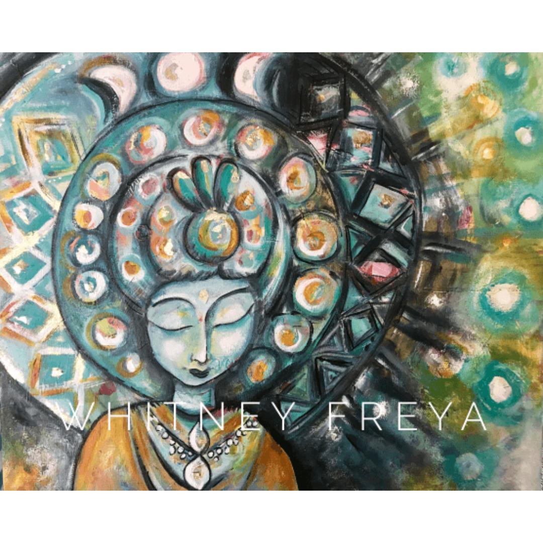 I love painting aspects of the divine feminine because they radiate such loving and powerful energy. The story of Quan Yin always reminds me to connect to my own center. She achieved enlightenment as a woman and when she was encouraged (by the male priests / monks) to get on with it and come back as a man--it was embarrassing to them that a woman could achieve this level of spiritual vibration--she vowed to remain incarnate as a WOMAN forever and to serve humanity with her compassion. In this painting she is also radiating mother eARTh energy, with the cycles of light & dark in the mandala surrounding her. She tells you that she loves ALL of you, the light and the dark, the acceptable and the un-acceptable. She brings to you whatever wisdom you need to stay in motion, to cycle into a period of abundance and self-compassion. And so it is.″